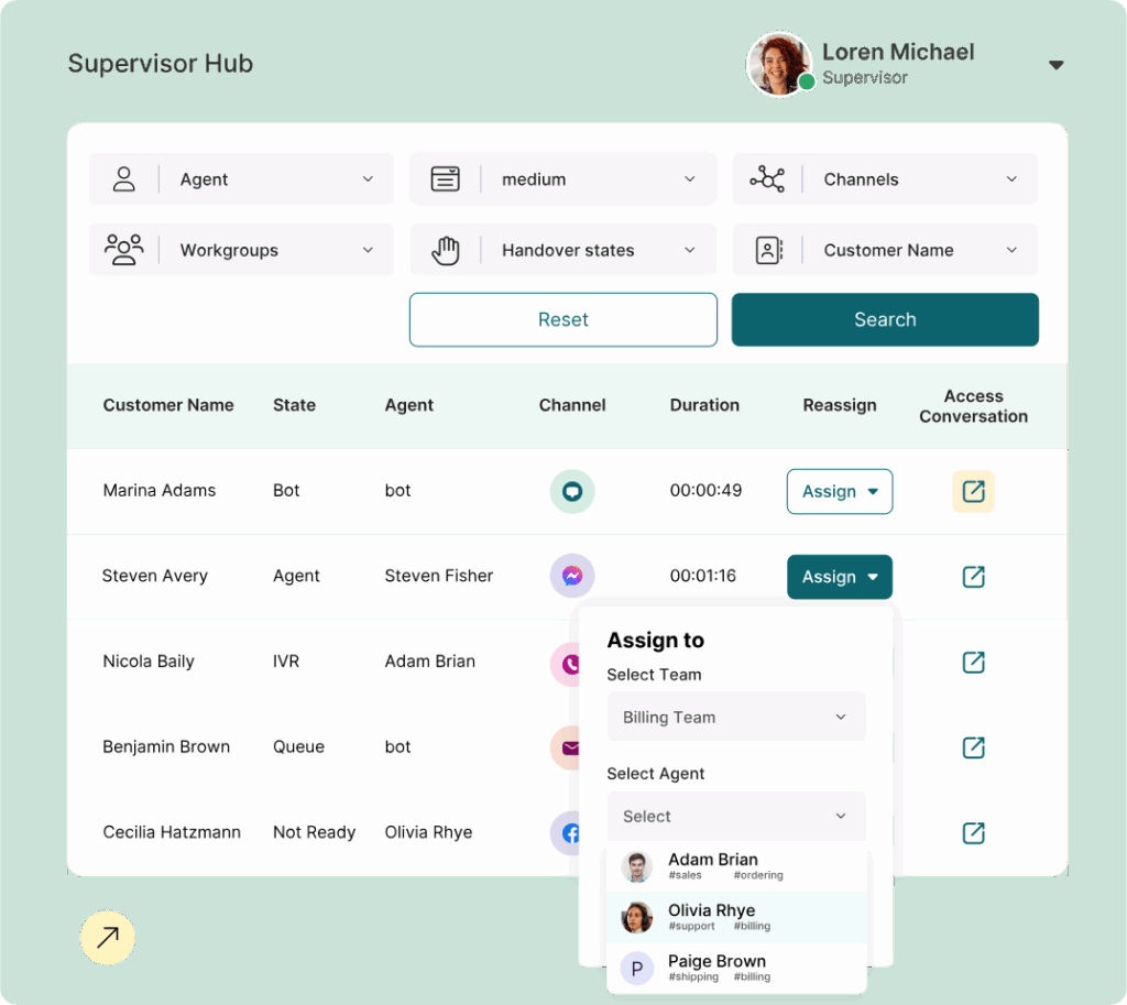 AI routes a customer’s conversation based on language, workgroup, department, or any other predefined characteristics.